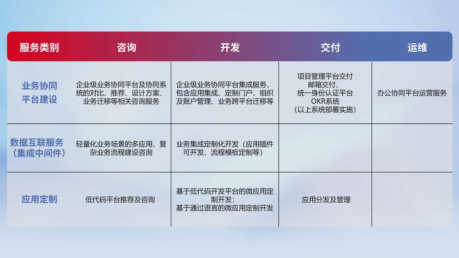 针对钉钉、、、、企微、、、、IDaas等平台级产品提供产品的规划、、、、方案、、、、交付、、、定制化开发等服务,,,实现如统一协同办公、、、智能客户服务、、、混合会议管理、、、、智能数据查询、、、、等业务场景,,,,实现数字化转型。。。